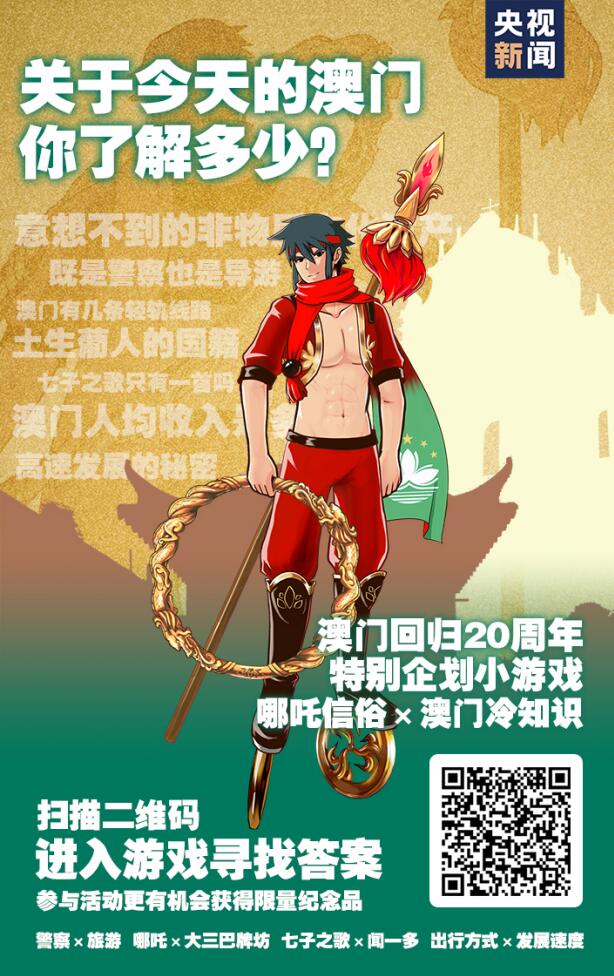 還想再看看小編手繪的帥氣哪吒嗎?還想多了解一下澳門的冷知識嗎? 來,讓我們一起來玩一個“找不同”的小游戲,找到不同,集齊裝備,你不但能了解關(guān)于澳門的冷知識,還可以通過完成游戲,有機會獲得中央廣播電視總臺新聞新媒體中心聯(lián)合中國郵政推出的“澳門哪吒信俗”限量版紀(jì)念明信片。 只要長按文章下方海報讀取二維碼,或者點擊這里就可以進(jìn)入游戲了!