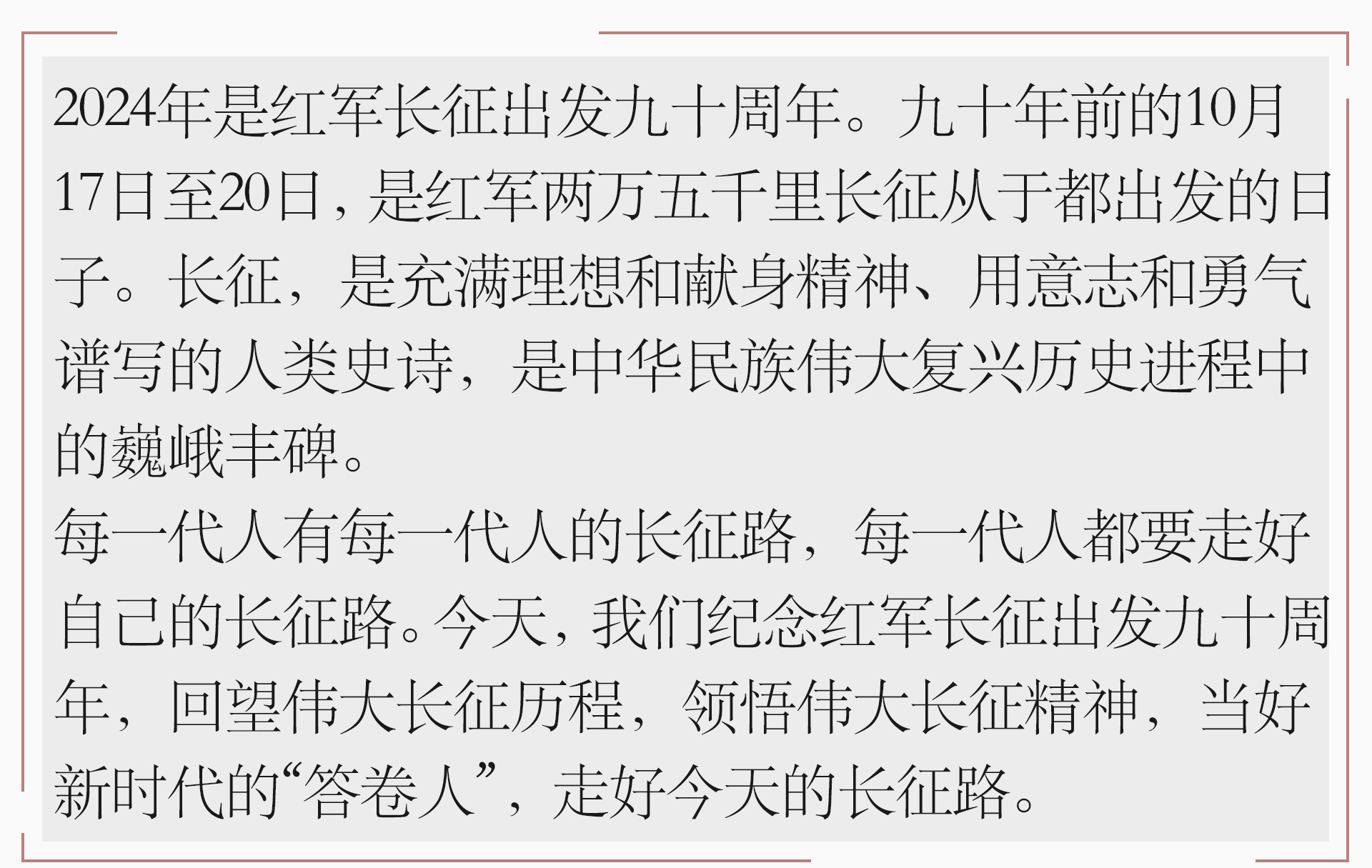 長征勝利啟示我們:人民群眾有著無盡的智慧和力量,只有始終相信人民,緊緊依靠人民,充分調動廣大人民的積極性、主動性、創(chuàng)造性,才能凝聚起眾志成城的磅礴之力。