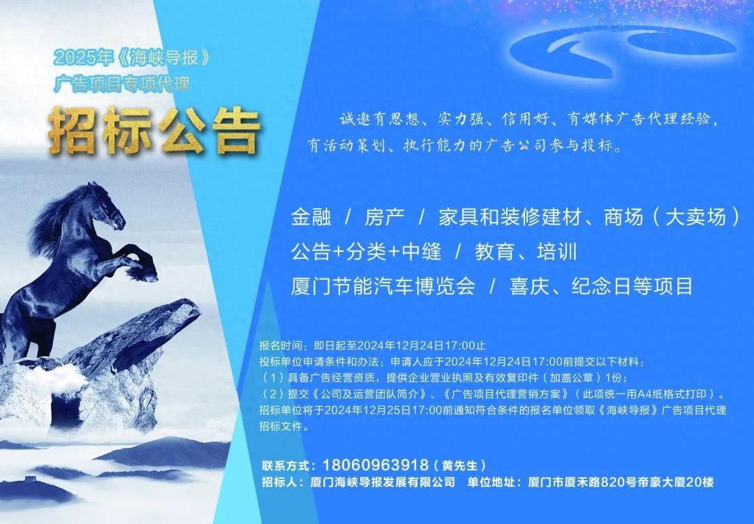 招標單位將于2024年12月25日17:00前通知符合條件的報名單位領取《海峽導報》廣告項目代理招標文件。