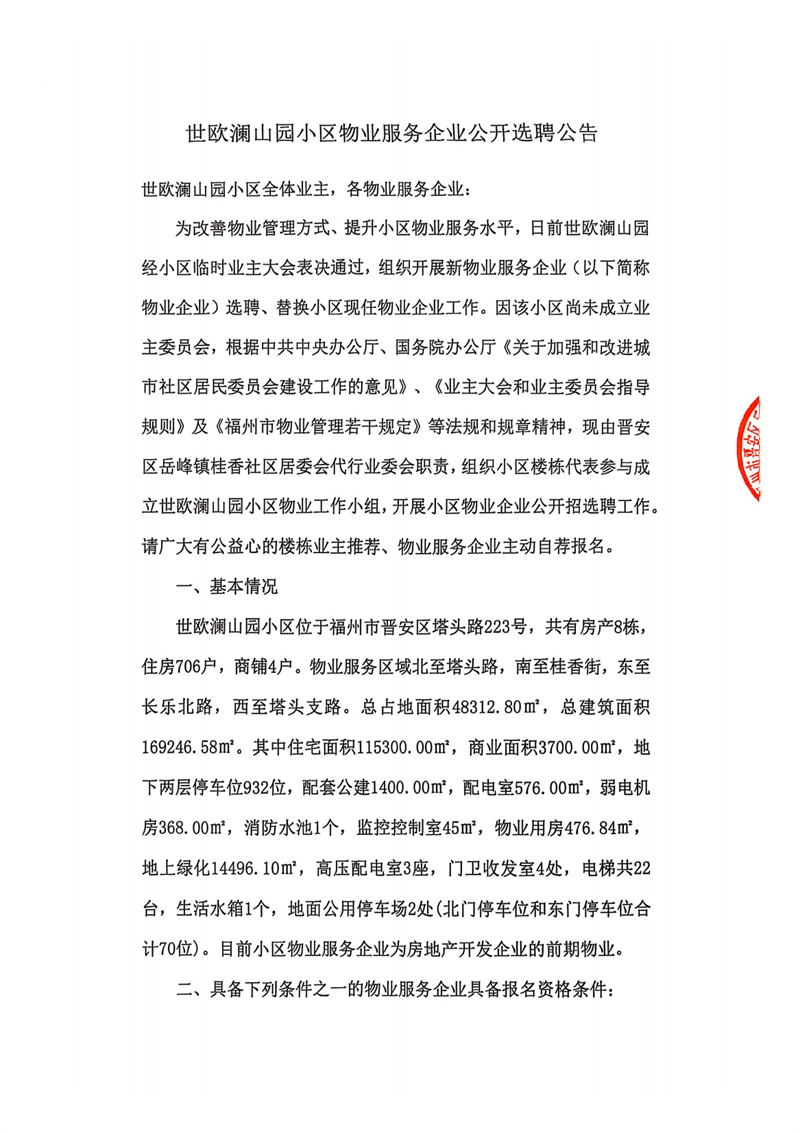 世歐瀾山園小區(qū)物業(yè)服務(wù)企業(yè)公開選聘公告