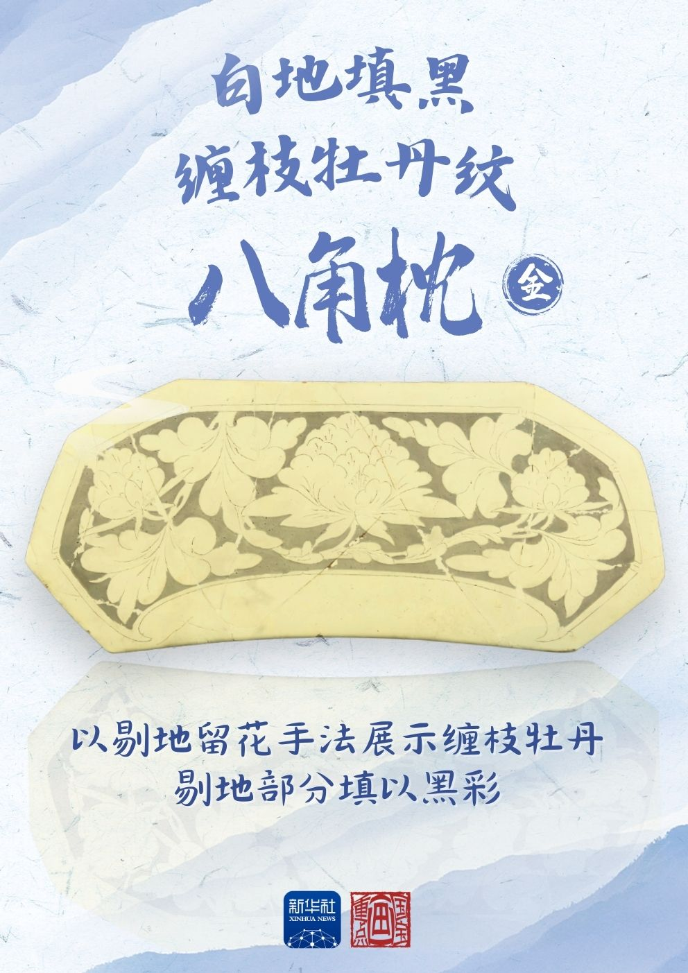 “谷雨洗纖素,裁為白牡丹” 這件白地填黑纏枝牡丹紋八角枕 是金代河津窯最具代表性的器物之一 造型上亦不拘一格 剔地部分填以黑彩 盡顯牡丹雍容華貴之美 體現出千年農耕文明的生活美學 當谷雨浸潤最后一寸春泥 花觚中的牡丹正在釉色里舒展 百鹿尊上的山嵐仍裹著草木清香 千年器物上 烙印著谷雨中的智慧 成為千年農時與春色相融的見證