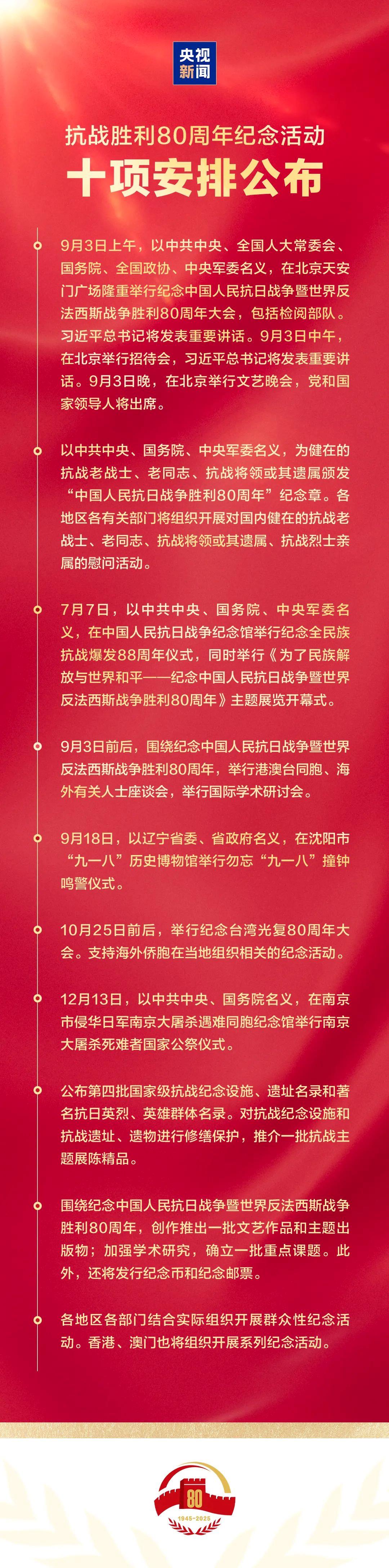 今天上午,國新辦舉行新聞發布會,介紹了紀念活動總體安排。主要的活動安排,共有十項。習近平總書記將出席紀念中國人民抗日戰爭暨世界反法西斯戰爭勝利80周年大會并發表重要講話。