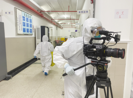 2月1日,上海廣播電視臺紀(jì)錄片中心編導(dǎo)范士廣、金翔在上海交大醫(yī)學(xué)院附屬瑞金醫(yī)院發(fā)熱門急診進(jìn)行拍攝。為精簡人員,他二人既是編導(dǎo)又是攝像,圖為金翔(右)正在攝像。上海廣播電視臺紀(jì)錄片中心 供圖