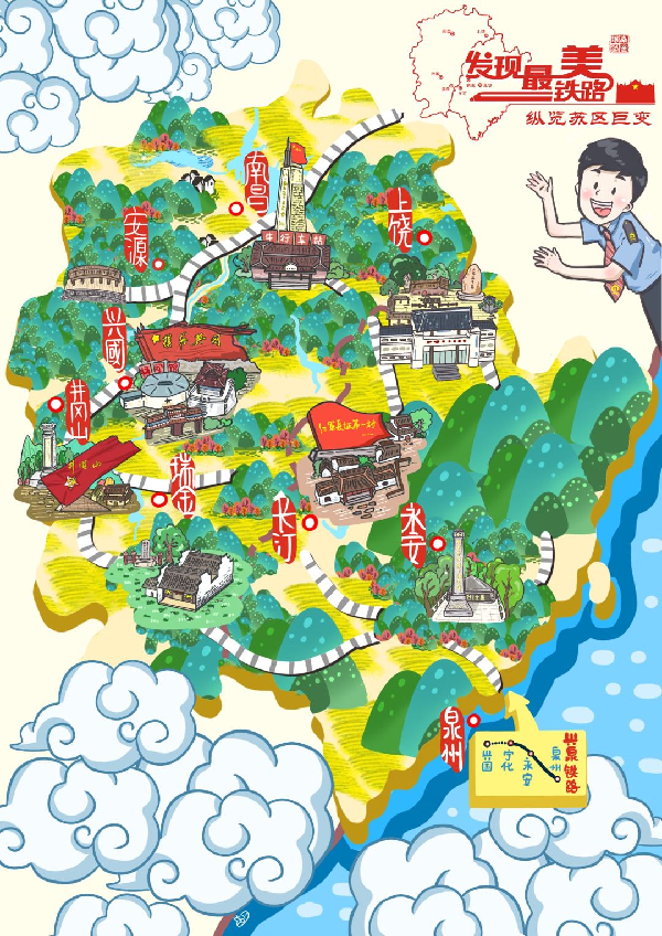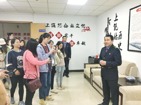 贛閩鐵路紅色環線示意圖。圖片來源:中國鐵路南昌局集團有限公司 4月23日至26日,參加該活動的媒體采訪團一行40余人,從英雄城南昌出發,沿著京九、贛瑞龍、南龍鐵路及昌贛、合福、滬昆高鐵組成的環線鐵路,重溫革命往事,探尋紅色故事,縱覽發展變遷,感悟初心傳承。南昌、興國、瑞金、長汀、清流、永安、上饒……由贛入閩,出閩入贛,4天時間雖然短暫,但媒體采訪團記者進車站、聽黨史、訪企業、入工地……通過實地探尋、走訪,見證鐵路在贛閩大地不斷延伸,沿途革命老區的經濟在快速發展。 上饒火車站:五次嬗變鑄就亮麗名片 據介紹,上饒火車站是全國首座垂直騎跨式高鐵樞紐站。滬昆高鐵、合福高鐵和滬昆鐵路在此呈十字交匯,形成了三場兩所格局,旅客可在站內方便快捷地實現無縫換乘。目前,該站日均停靠列車300多趟,是江西省內停靠列車最多的火車站。平均每日到發旅客5萬余人次。 上饒站黨總支書記陳衛紅告訴記者,火車站始建于1935年,經過1953年、1998年兩次原址重建,2006年搬遷到現址,2014年新站房落成運營,歷經了“五生五世”。贛東北的上饒因地理位置優越,交通便利,自古就有“八方通衢”“豫章第一門戶”之稱,鐵路的發展,車站的升級就像為饒城發展插上了隱形的翅膀。