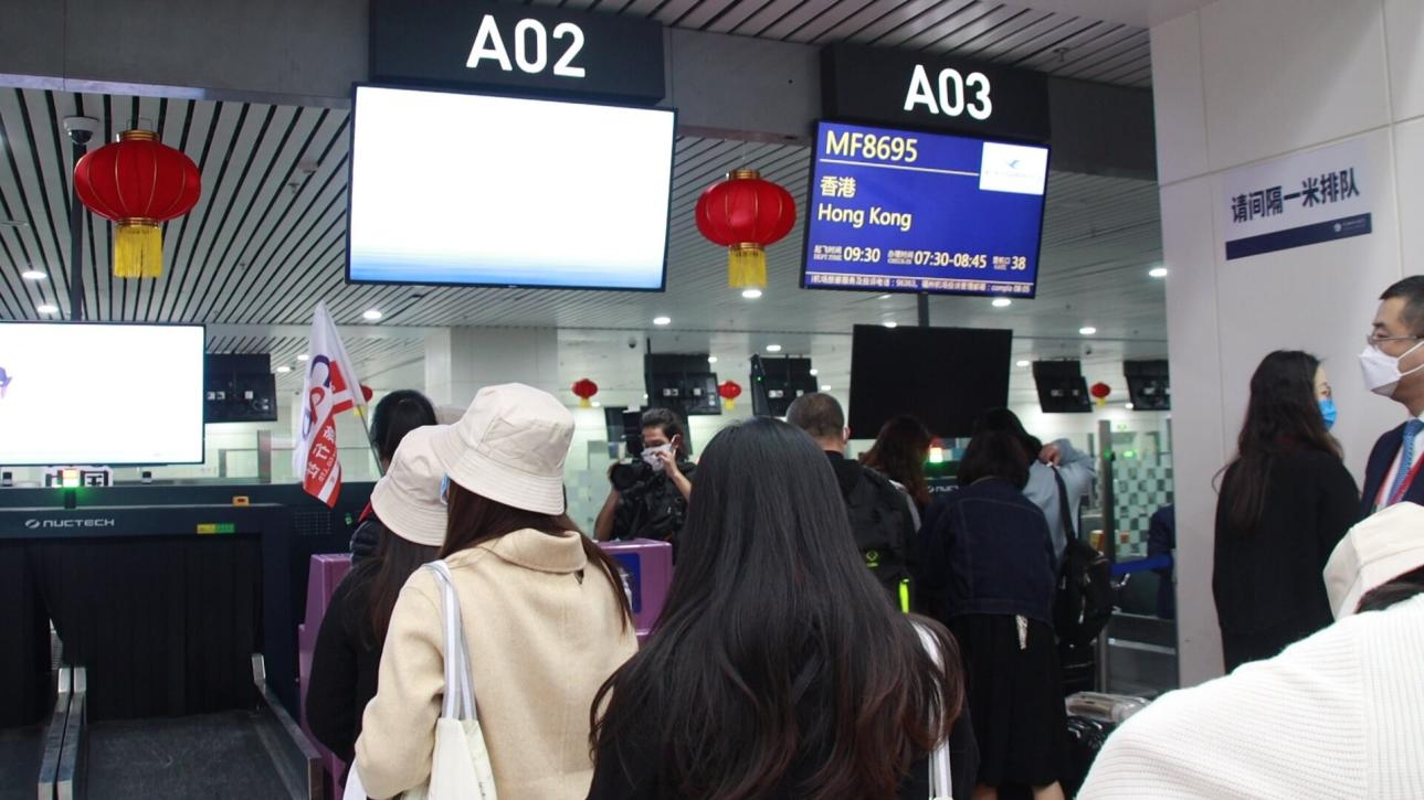 “2023福建省港澳游首發(fā)團(tuán)”出發(fā)現(xiàn)場 東南網(wǎng)記者 莊宇婧 攝 據(jù)了解,“2023福建省港澳游首發(fā)團(tuán)”的首批游客為建發(fā)國旅“香港你好”團(tuán),共有42名游客組成。該團(tuán)從福州出發(fā),行程設(shè)計以半自助團(tuán)隊游為主,旅行團(tuán)將會帶領(lǐng)游客暢游香港迪士尼樂園,并且還將安排自由活動時間供游客自主安排行程。