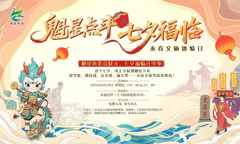 留言集祝福 好禮送心意 這個七夕,愿魁星為您的巧思與情意點斗賜福! 在東南網微信公眾號《文末贏好禮!七夕之夜來上下杭永德會館 永春文旅多重體驗等你來玩→》文章評論區帶話題 #魁星點斗 七夕福臨# 并留下您的七夕祝福或心愿,精選留言中點贊數最高的前8位幸運網友,將獲得北溪文苑生態旅游區門票或永春牛姆林生態旅游門票1張! 愿您一字一句皆浪漫,一舉一動得祝福~ 快來寫下祝福參與互動話題,讓鵲橋搭往幸福之處吧! 無論你是想求好運、曬浪漫 還是品文化、贏好禮 這里都有讓你心動的完美體驗! 8月29日晚19:00 福州上下杭永德會館 等你共赴浪漫之約! |