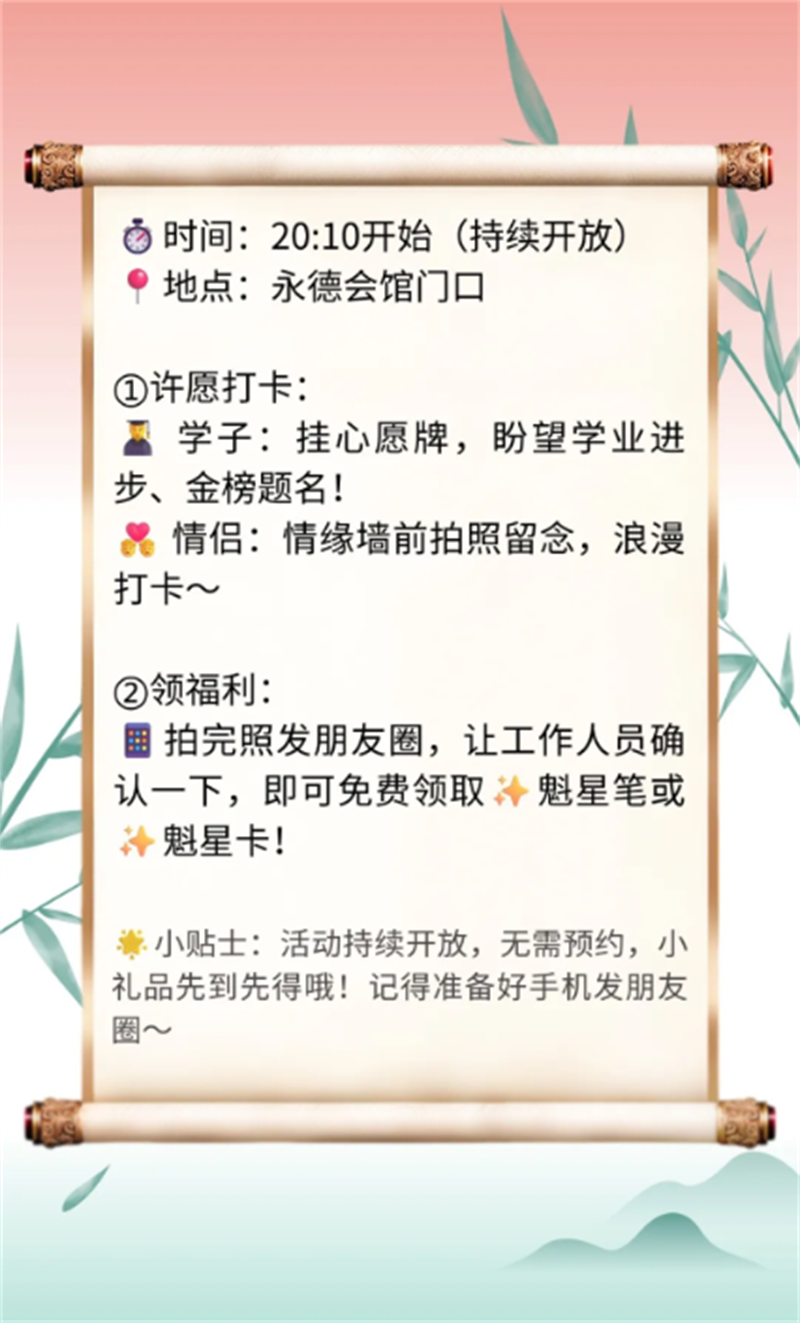 古法篆香 花式打卡·雙倍好運 -魁星賜福- 精心調制朱砂墨 狀元郎NPC在線“點斗” 學業有成、金榜題名 一舉奪魁不是夢! -良緣永結- 情緣墻前共系心愿牌 百年古厝見證浪漫誓言!