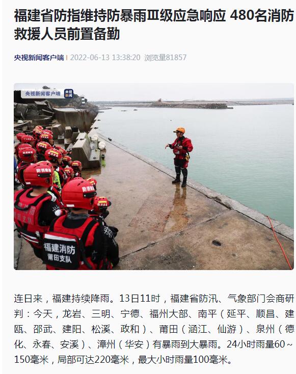 [央視新聞客戶端]福建省防指維持防暴雨Ⅲ級應急響應 480名消防救援人員前置備勤
