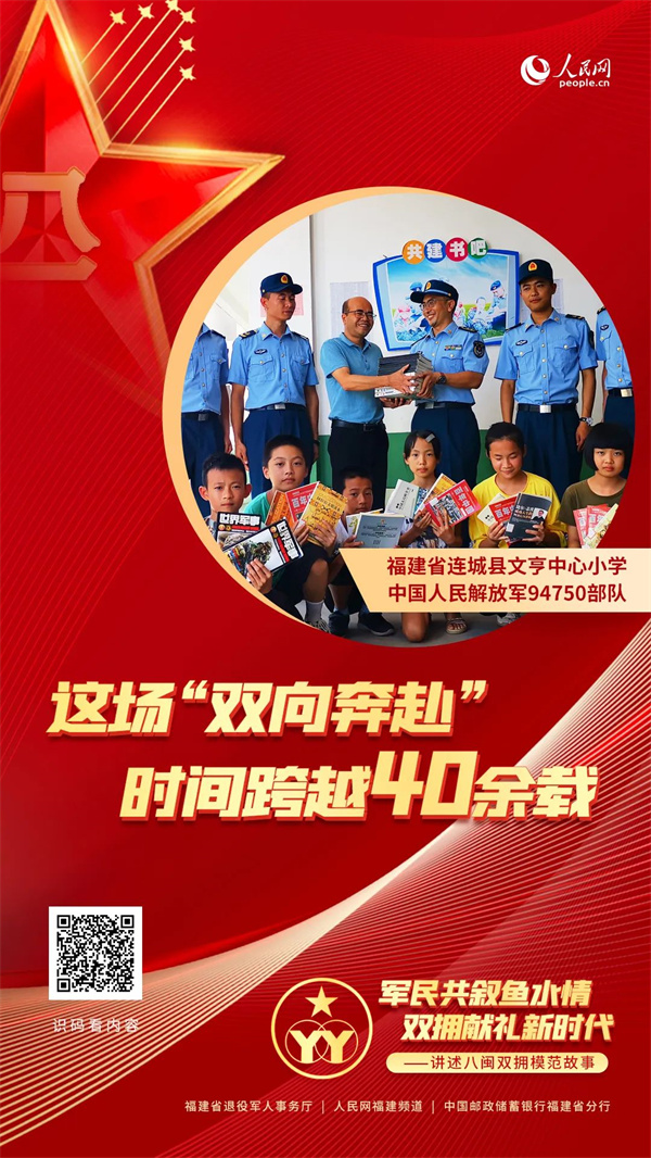 “軍愛民、民擁軍,軍民魚水一家親。”福建,是全國唯一所有設區市連續五屆獲評雙擁模范城(縣)的省份,一個個軍愛民、民擁軍的生動故事在八閩大地不斷涌現。為唱響閩山閩水間的“愛我人民愛我軍”軍民情主旋律,福建省退役軍人事務廳聯合人民網福建頻道、中國郵政儲蓄銀行福建省分行共同推出“軍民共敘魚水情 雙擁獻禮新時代”主題宣傳活動,從“新時代八閩雙擁故事”看福建如何續寫新征程上的雙擁新篇章。 本期嘉賓:中國人民解放軍94750部隊 福建省連城縣文亨中心小學
