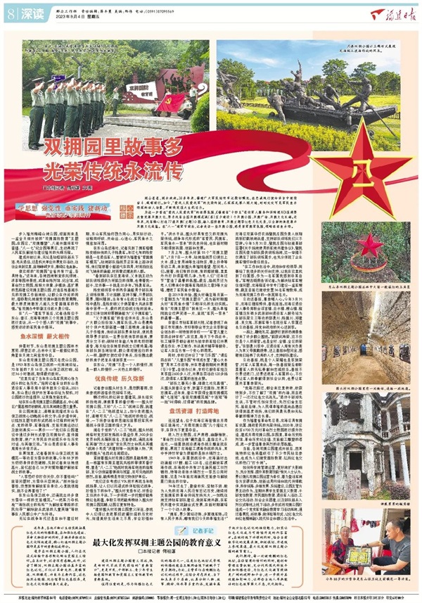 核心提示 閩山蒼蒼,閩水泱泱。30多年來,福建廣大軍民始終牢記殷切囑托,在忠誠踐行使命宗旨中接續奮斗、砥礪前行。如今,“愛我人民愛我軍”的光榮傳統,已深深扎根八閩大地,時時處處可見軍民魚水情深的動人場景,不斷煥發強大生機活力。 為進一步營造“愛我人民愛我軍”的濃厚氛圍,《福建省“十四五”退役軍人服務和保障規劃》強調要注重發展雙擁文化,要求我省全國雙擁模范城(縣)至少建設1個雙擁公園、雙擁廣場、雙擁文化長廊。近年來,我省精心打造77座雙擁(主題)公園,融入國防教育、雙擁主題等紅色文化元素,以全新的角度展示雙擁文化底蘊。在“八一”建軍節前后,走訪一些雙擁公園,感受崇軍擁軍氛圍,領略濃濃魚水情。