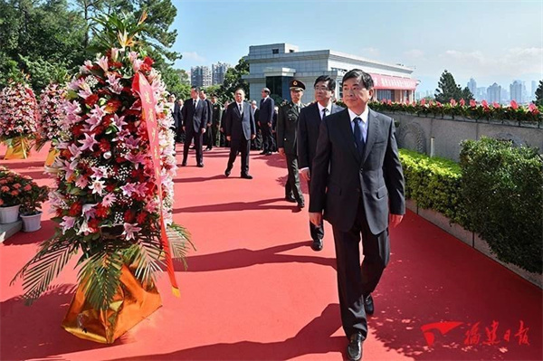 在我國第十個烈士紀念日到來之際,9月30日,福建省、福州市在福州文林山革命烈士陵園隆重舉行向革命烈士敬獻花籃儀式。省委書記、省人大常委會主任周祖翼,省委副書記、省長趙龍,駐閩部隊領導唐興華,與省、市各界代表一道,向革命烈士紀念碑敬獻花籃。 浩氣存天地,青山護忠魂。秋日金暉中,蒼松翠柏環繞的文林山革命烈士陵園莊嚴肅穆,革命烈士紀念碑巍然屹立。廣場臺階前,以省委,省人大常委會,省政府,省政協,駐閩解放軍和武警部隊官兵,省各民主黨派、工商聯和無黨派人士,省各人民團體和省、市各界群眾,老戰士、老同志和烈士親屬,全省少先隊員名義分別敬獻的9個花籃一字排開,花籃紅色緞帶上書寫著“革命烈士永垂不朽”的金色大字。 上午9時整,儀式開始。在雄壯的《義勇軍進行曲》中,全場齊聲高唱中華人民共和國國歌。國歌唱畢,全體肅立,向革命烈士默哀。默哀畢,手持鮮花的少先隊員齊聲獻唱《我們是共產主義接班人》,并面向革命烈士紀念碑致少年先鋒隊隊禮。