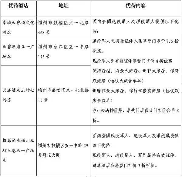 儀式上,田德強(qiáng)表示,鼓樓區(qū)是駐軍大區(qū),素有擁軍優(yōu)屬,擁政愛民的光榮傳統(tǒng),非常感謝擁軍酒店支持鼓樓區(qū)雙擁工作,以最大的優(yōu)惠和誠意服務(wù)現(xiàn)役和退役軍人。 酒店負(fù)責(zé)人紛紛表示加入鼓樓區(qū)“愛國擁軍聯(lián)盟”既是榮譽(yù)更是責(zé)任,今后酒店將強(qiáng)化管理、優(yōu)化服務(wù),讓廣大現(xiàn)役軍人、退役軍人和軍屬充分感受到溫暖,為鼓樓區(qū)雙擁工作增光添彩。 根據(jù)協(xié)議,福州星宸未來酒店管理有限公司旗下景城云睿福文化酒店、云睿酒店五一廣場(chǎng)店、云睿酒店三坊七巷店,福州金星商務(wù)酒店有限責(zé)任公司(格菲酒店)將提供以下優(yōu)待: 擁軍酒店住宿優(yōu)待目錄清單