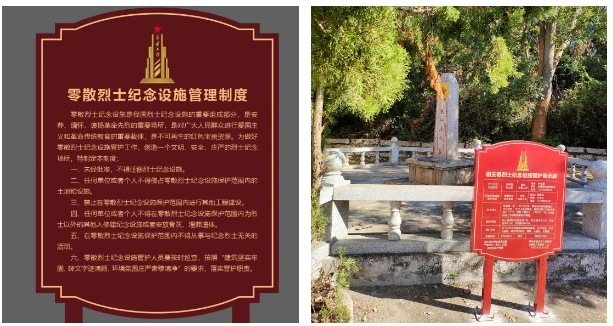 今年9月,烈士紀(jì)念設(shè)施保護(hù)標(biāo)志及標(biāo)識(shí)牌正式公布啟用后,省退役軍人事務(wù)廳按照退役軍人事務(wù)部《關(guān)于啟用烈士紀(jì)念設(shè)施保護(hù)標(biāo)志及標(biāo)識(shí)牌的通知》《烈士紀(jì)念設(shè)施保護(hù)標(biāo)志使用管理辦法》要求,迅速部署、統(tǒng)一標(biāo)準(zhǔn),循序漸進(jìn),制作使用保護(hù)標(biāo)志及設(shè)立保護(hù)標(biāo)識(shí)牌。 10月15日,在泉州惠安縣啟用鍍鋅鋼板材質(zhì)豎匾式零散烈士紀(jì)念設(shè)施保護(hù)標(biāo)志告示牌。告示牌正面為紅底黃字設(shè)計(jì),寓意紅色基因代代相傳,上方設(shè)烈士紀(jì)念設(shè)施保護(hù)標(biāo)志,下方為設(shè)施名稱、管護(hù)等級(jí)、設(shè)施編號(hào)、烈士簡(jiǎn)介、管護(hù)范圍、管護(hù)目標(biāo)、鎮(zhèn)級(jí)監(jiān)管員信息、村級(jí)巡視員信息、設(shè)立日期等;告示牌背面為管護(hù)制度。