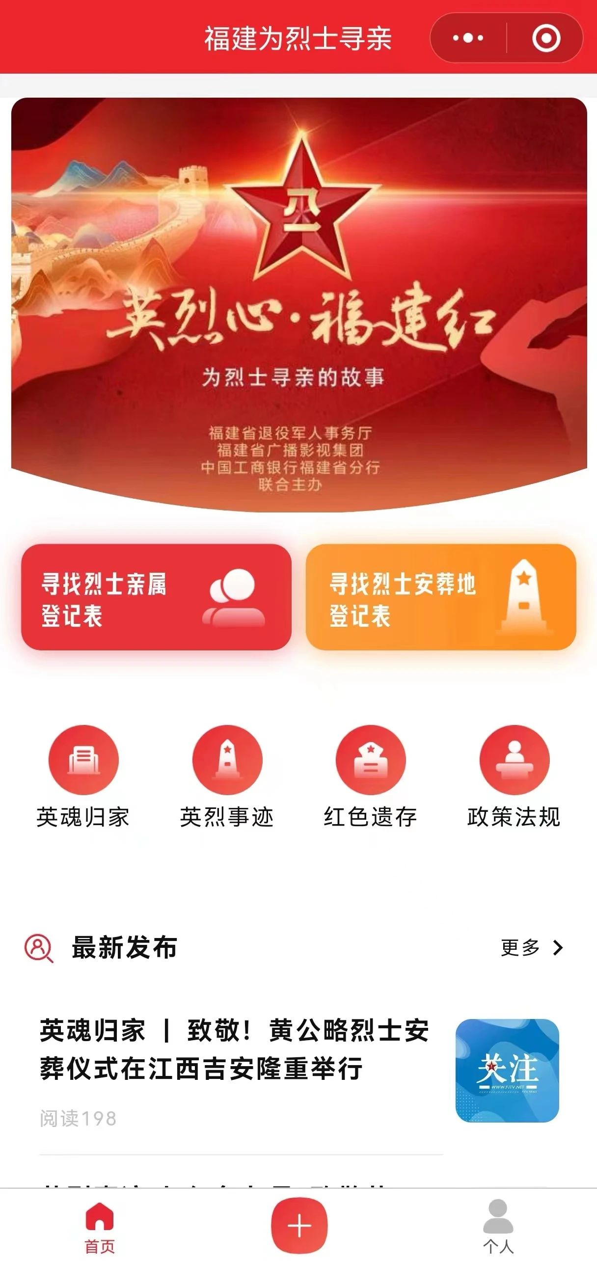 山河無恙,英雄歸家。第十一個烈士紀(jì)念日即將到來之際,福建省退役軍人事務(wù)廳今日正式上線開通“福建為烈士尋親”小程序。小程序是我省全面推進烈士尋親工作的一項重要舉措,集成了為烈士尋親登記申請、尋親信息發(fā)布、英烈事跡宣傳、烈士紀(jì)念設(shè)施展示、政策法規(guī)普及等功能模塊,有效暢通退役軍人事務(wù)系統(tǒng)、群眾、媒體、社會組織等各界力量參與為烈士尋親工作的渠道。