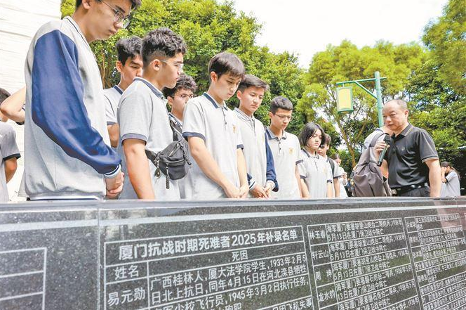 日前,廈門市中學生在五通燈塔公園聆聽英烈故事,觀看廈門抗戰時期死難者名錄碑及2025年補錄名單。(唐光峰 攝)