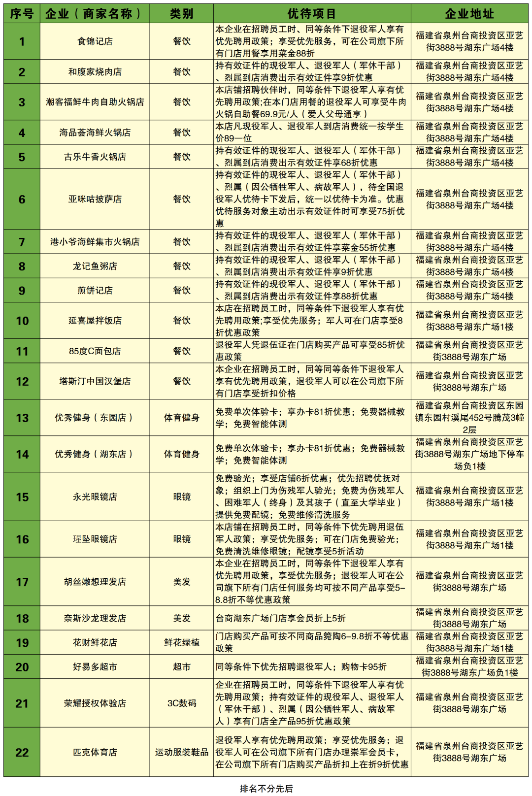 作為泉州臺商投資區首個商業綜合體擁軍示范點,湖東廣場“擁軍商場”首批匯聚了21家優質商戶資源,將為現役、退役軍人及其他優撫對象提供“優質產品、優先待遇、優惠價格”的“三優”服務,凡現役、退役軍人及其他優撫對象持相關證件,即可享受消費折扣等相關優惠。