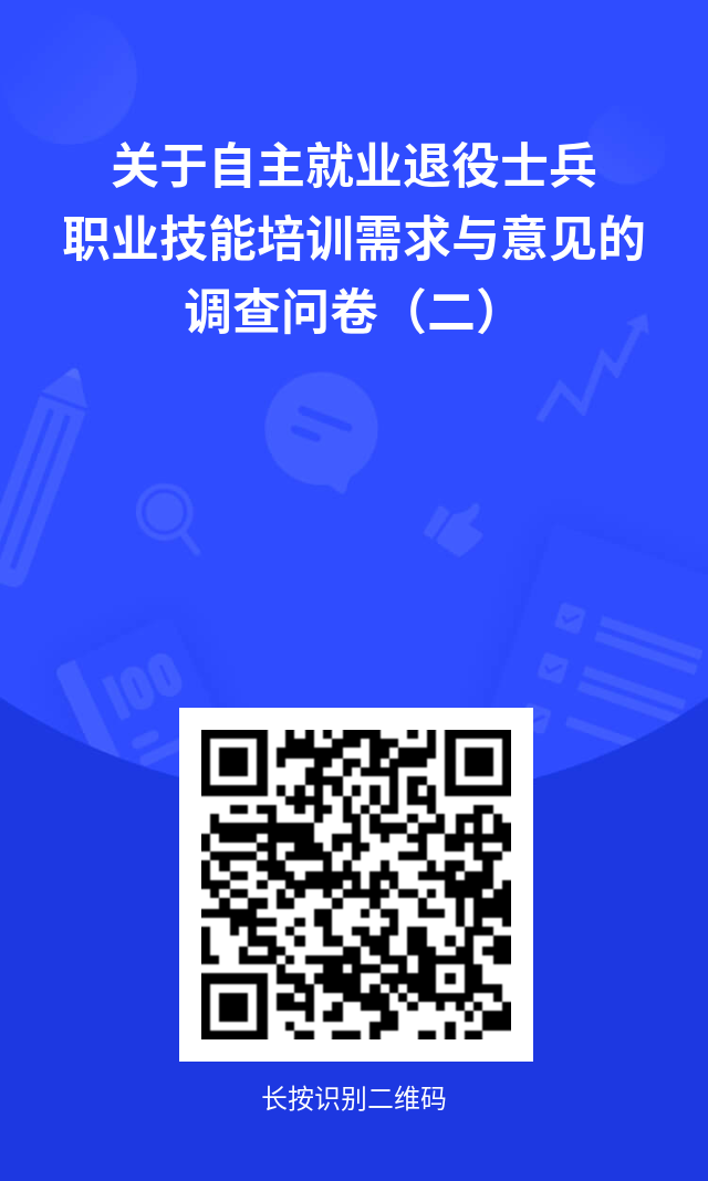 為更好地了解職業技能培訓的實際需求,提升自主就業退役士兵職業技能培訓工作的針對性和有效性,幫助大家順利實現從軍營到地方的職業轉變,提升就業競爭力,省退役軍人事務廳安置就業處開展此次問卷調查。此次問卷調查共分為兩個部分,請您分別掃描下列二維碼,按提示要求依次如實填寫。本問卷實行匿名填寫,所有數據僅用于統計分析,我們將對您的個人信息嚴格保密。感謝您的支持與合作!