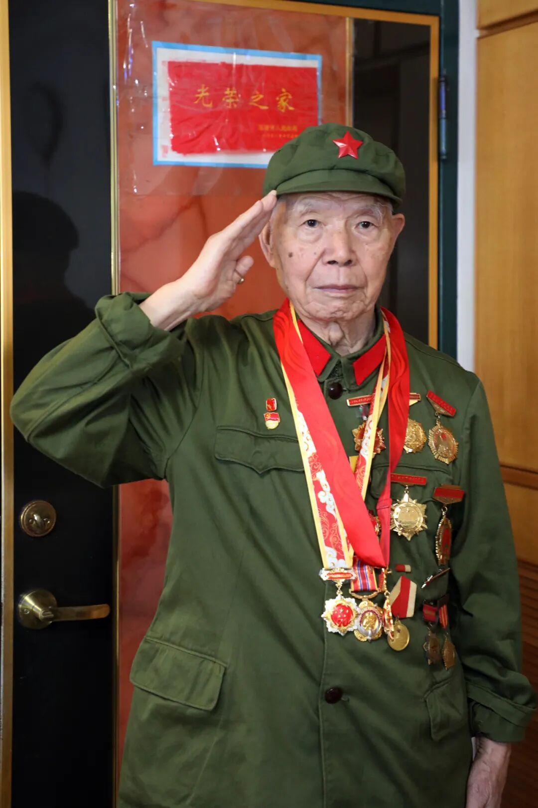 ▲張宜順敬禮 “日本強盜莫須怕,送上面前一聲殺!我們消滅他!我們打垮他!殺、殺、殺……”92歲的抗戰老兵張宜順至今仍能鏗鏘有力地唱出兒時學會的抗戰歌謠。這歌聲,是他烽火歲月的印記,也是他一生信念的起點。