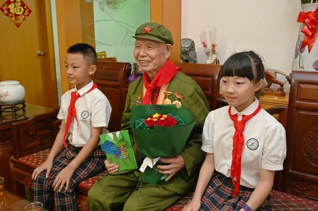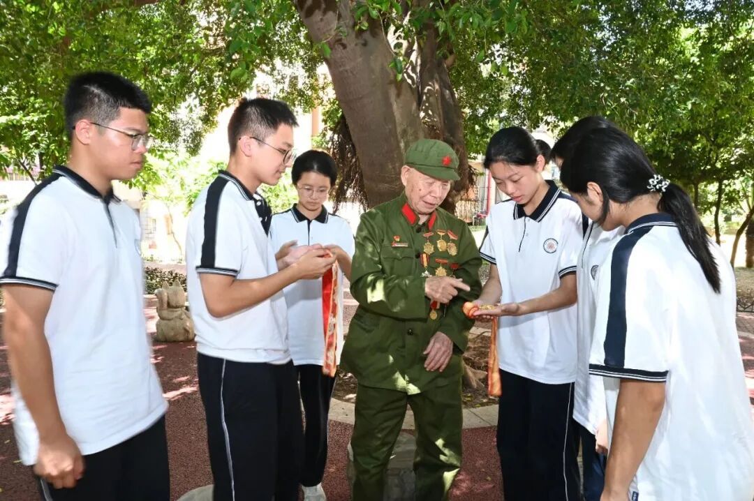 ▲2025年6月9日,92歲的抗戰老兵張宜順在漳州市紅色抗戰書籍贈書儀式上,講述家族抗戰史。(漳州市退役軍人事務局 供圖) 如今,92歲高齡的張宜順仍活躍在愛國教育的第一線。他經常走進學校、社區,用親身經歷講述抗戰故事,教育年輕一代銘記歷史、珍惜和平。他的講述,已成為漳州很多學子“開學第一課”上最動人的篇章。“我要把戰友們的故事講下去,讓更多的人知道今天的幸福生活來之不易。”張宜順說。 “這枚抗戰勝利80周年紀念章對您意味著什么?”8月底,在漳州市第三中學內一場以“烽火記憶照前路 青春礪劍啟新程”為主題的歷史與國防教育活動中,一群學子圍在張宜順身邊提問。張宜順感慨道,這意味著“銘記歷史,緬懷先烈,永遠跟黨走!”學生鄭琪歆感動地說:“爺爺眼里有光——那是穿越戰火卻從未黯淡的信念!”青春的目光與滄桑的眼神在此交會,歷史與未來彼此照亮。