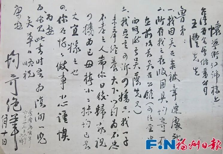 王正均。(受訪者供圖) “魯?shù)埽何乙騾鞘副粻窟B處死……我無言可訴!四嬸只我一子,未奉終養(yǎng),天下以均為不忠不孝之人。希你日后歸家,視四嬸為己母……” 這封寫在長40厘米、寬25厘米毛邊紙上的絕筆書,字跡從容,字句間滿是赤誠與遺憾。絕筆書的主人,是福州籍隱蔽戰(zhàn)線英烈王正均。這是他就義前,寫給堂弟王正魯?shù)脑E別信。