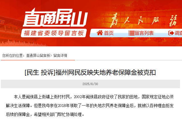 福州閩侯林先生反映,當地不少村民在政府征地后自行參加了靈活就業人員養老保險,到退休年齡時,當地卻以此為由不予發放被征地農民養老保障金。福州多地存在類似情況。