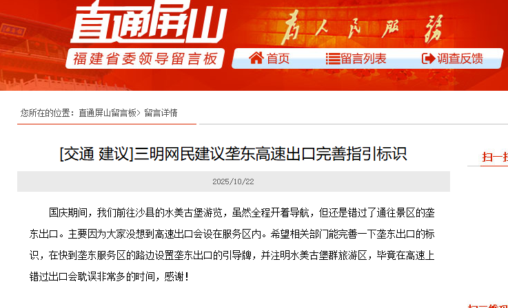 日前,有網友反映,三明壟東高速出入口設在服務區內很容易錯過,針對此事,東南網記者先后聯系了相關部門,均得到的回復是“完善標識的責任不在自己”。